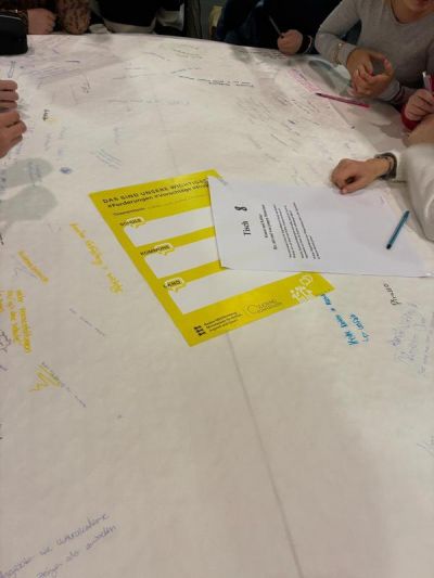 Anschließend startete das sogenannte Speed-Café. Dabei setzten sich die Schülerinnen und Schüler an verschiedenen Thementischen mit insgesamt zehn Themen auseinander, notierten erste Gedanken und tauschten sich kurz aus. Behandelt wurden unter anderem die Themen Politik, Kultur, Sicherheit, Jugendaustausch sowie die neue Handyregelung.