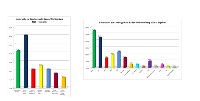Am Freitag, dem 6. März 2026, fand an unserer Schule im Rahmen der Landtagswahl in Baden-Württemberg die sogenannte Juniorwahl statt. Die Juniorwahl ist ein bundesweites Schulprojekt zur politischen Bildung. Ziel ist es, Schülerinnen und Schülern den Ablauf demokratischer Wahlen praxisnah zu vermitteln und ihr Interesse an politischen Themen zu stärken. Die Wahl wird dabei möglichst realitätsnah organisiert – mit Wahlbenachrichtigungen, Wahlkabinen, Stimmzetteln und einer anschließenden Auszählung der Stimmen.